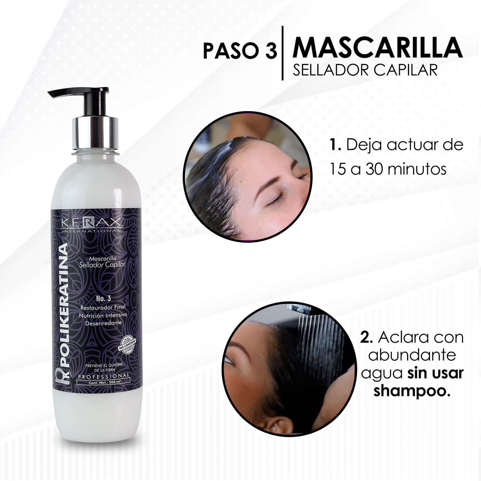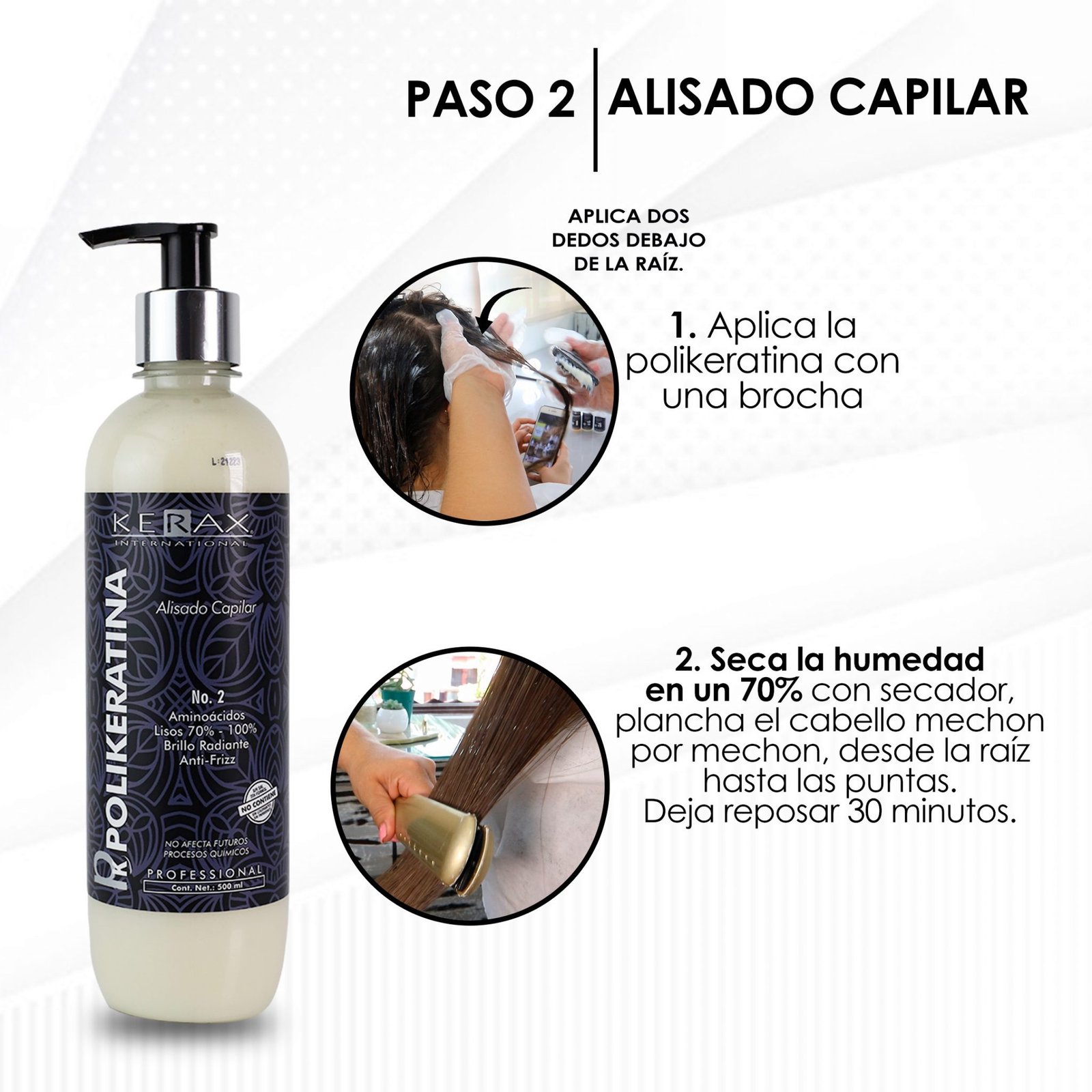 Polikeratina es una mezcla única de aminoácidos que trabajan juntos para reparar profundamente el cabello, mientras que suavizan el frizz y las ondas y agregan brillo, puede dar un liso hasta del 90% en la primera aplicación. El manejo y la peinabilidad del cabello mejorán notablemente.